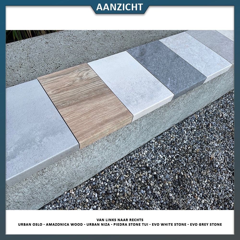 Voor een prachtig geheel zijn er ook bijpassende keramische tegels leverbaar in dezelfde Madera Wood Amazonica houtlook. Hiermee creëer je een doorlopend, warm terras dat naadloos aansluit op de zwembadrand. Beschikbare maten: